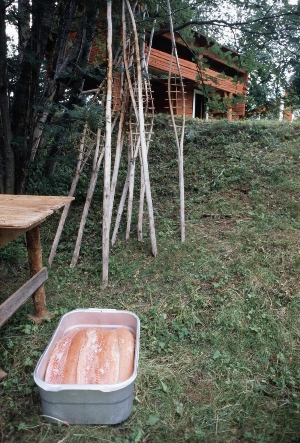 Suolatut lohet astiassa odottavat sitomista ja paistamista. Taustalla on lohivartaita. Kuva Rainer Hiuspää, Totto ry:n kokoelmat.