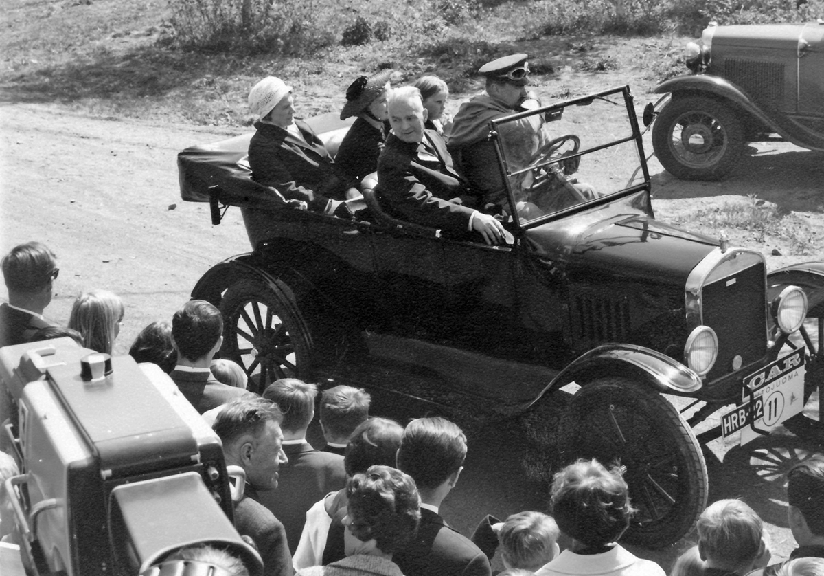 Tampereeen ensimmäiset retkeilyajot vuonna 1966. Leila Suutarinen isovanhempineen T-Fordissa, jonka entisöinti valmistui edellisenä vuonna. Tapahtuma kuvattiin televisioon – vasemmassa reunassa näkyy iso kamera. Ajojen sponsorina oli CAR-limonadi (mainos ajokyltissä). Kuvaaja Rainer Stolze, Vehoniemen Automuseon kokoelmat.