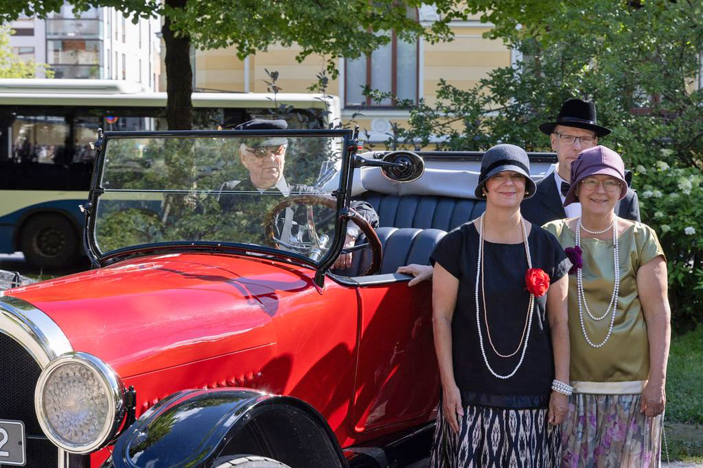 Kanttiautokruisingin osallistujen ajoneuvon valmistusajan mukaisia aikakauden asuja. Paikkana Hämeenpuisto, Tampere. Kuvaaja Tero Hakala.