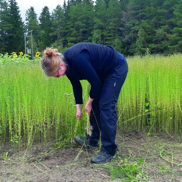 Pellavan nyhtämistä Suomen maatalousmuseo Saran pellavamaalla. Kuva: Elsa Hietala / Suomen maatalousmuseo Sarka.