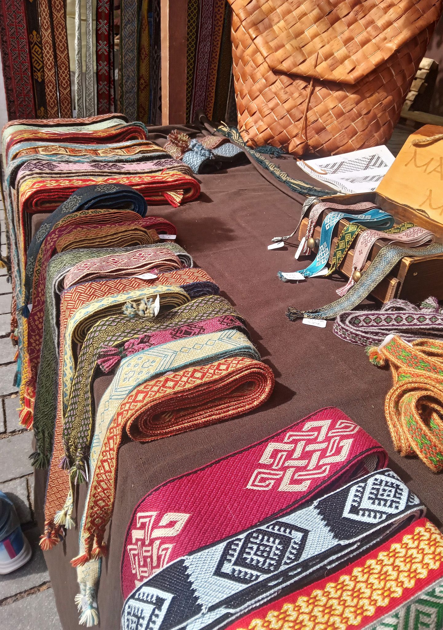 Kuva: Aino Hujanen, 2025. Kokoelma: Lautanauhan kutominen. Kuvassa on Maakari Monican kutomia lautanauhoja myynnissä Turun keskiaikamarkkinoilla.