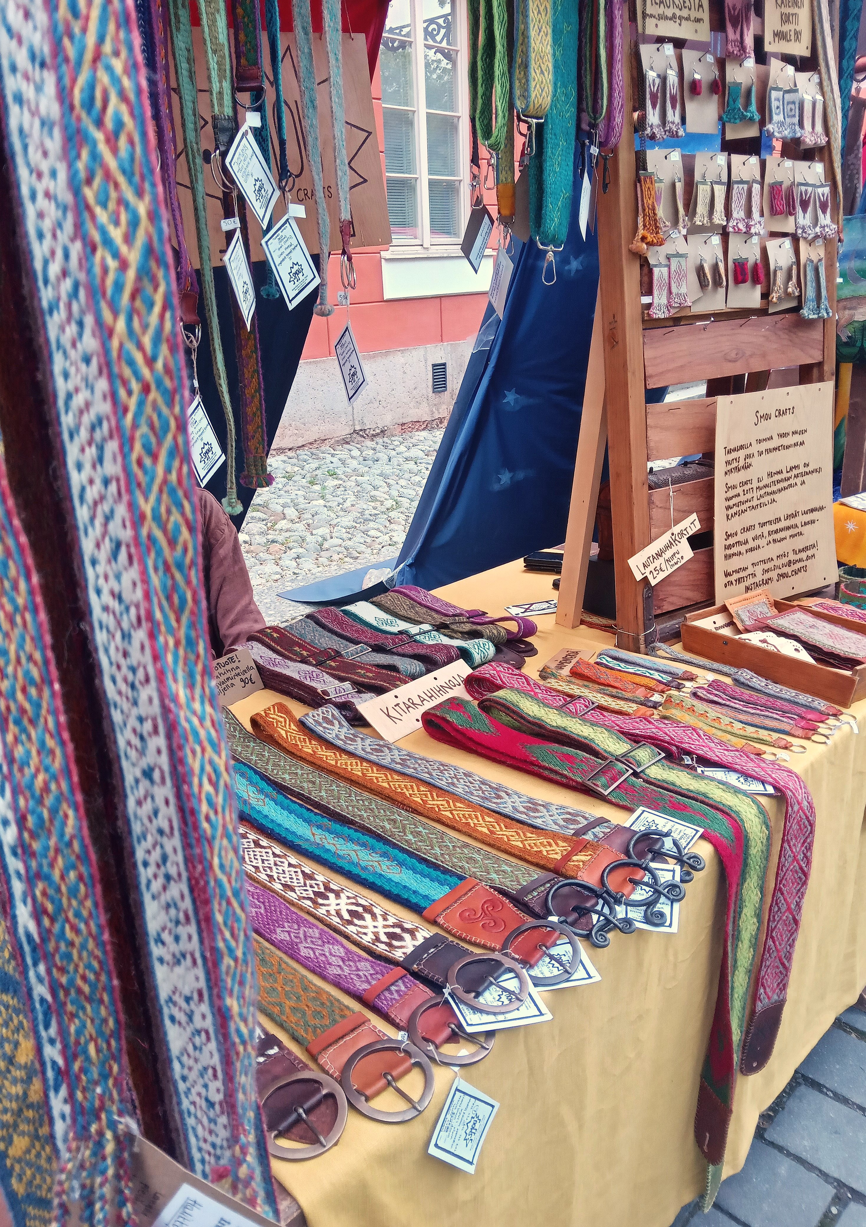 Kuva: Aino Hujanen, 2025. Kokoelma: Lautanauhan kutominen. Kuvaus: Kuvassa on Smou Craftsin valmistamia lautanauha-asusteita myynnissä Turun keskiaikamarkkinoilla.