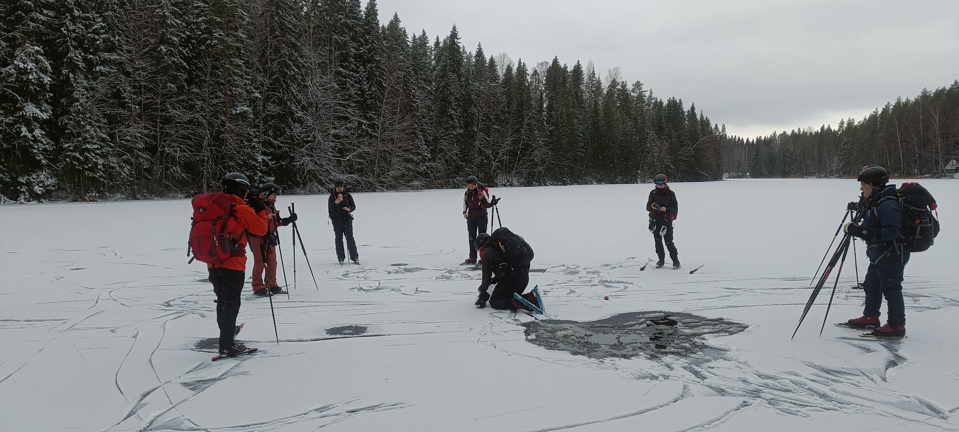 Omatoimiretki- ja apuvetäjäkurssilaiset tutkimassa jään vahvuutta ja rakennetta joulukuussa 2024.