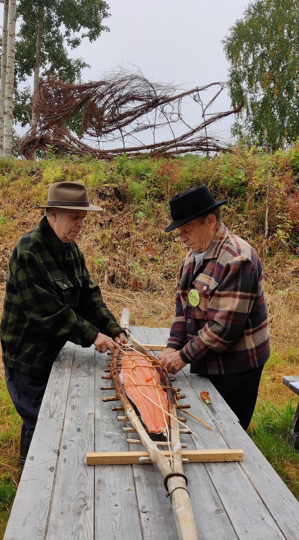 Lohta sitomassa Veikko Vaarala ja Pekka Ylikunnari 8.9.2022. Taustalla osa Acta Fast -hankkeen pajuteoksesta Vaelluskalat.